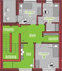 erreichst Du vom Treppenaufgang aus. Geradeaus befindet sich die Diele, von der aus die Zimmer 1, 2 und 3
