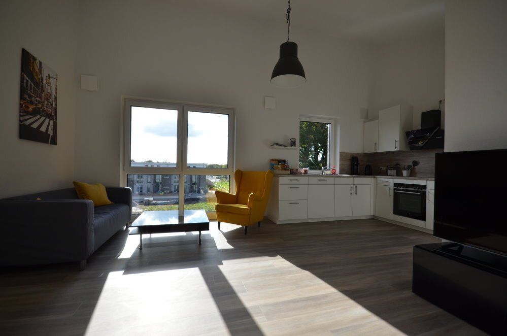 Vom Wohnungseingang geht rechts die Treppe ins Dachgeschoss. Dort erwartet Dich ein außergewöhnliches Raumerlebnis im urbanen Loft-Design mit einer Raumhöhe von bis zu 4 Metern. Bereits vom Treppenaufgang fällt Dein Blick auf die einladend wirkende Außen-Loggia. Rechtsseitig erblickst Du die lichtdurchflutete Chill-out-Area mit großem Flatscreen (55 Zoll) und trendiger Studio-Möblierung. Dahinter erblickst Du die offene Küche mit Herd, Kühlschrank (inkl. Gefrierfach) und Spüle. Ein idealer Ort zum Kochen, Essen & Verweilen. Auf dieser Etage ist auch das Zimmer 4 sowie ein Wäscheraum mit Waschmaschine und Trockner (Münzautomat).